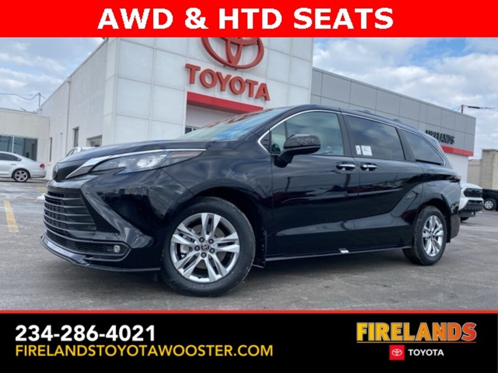 Midnight Black Metallic 2026 Toyota Sienna XLE 7 Passenger AWD CVT 2.5L I4 4WD/4X4/AWD, Heated Seats, Sunroof/Moonroof, CarPlay, Android Auto, Bluetooth, Backup Camera, Blind Spot Monitoring, Lane Departure Warning, Parking Sensors, Automatic Parking, Brake Assist, Steering Wheel Controls, Cruise Control, Keyless Start, Keyless Entry, Power Lift Gate, Premium Audio, Third Row Seats, Premium/Alloy Wheels, Sienna XLE 7 Passenger, AWD, 1500 Watt Inverter Output, 17" Alloy Wheels, 3rd row seats: split-bench, ABS brakes, All Weather Floor Liners, AM/FM radio: SiriusXM, Apple CarPlay/Android Auto, Auto-dimming Rear-View mirror, Automatic temperature control, Body Side Molding, Brake assist, Bumpers: body-color, Compass, Driver's Seat Mounted Armrest, Electronic Stability Control, Emergency communication system: Safety Connect (3-year trial), Exterior Parking Camera Rear, Front anti-roll bar, Front Bucket Seats, Front dual zone A/C, Front fog lights, Front Heated Bucket Seats, Fully automatic headlights, Garage door transmitter: HomeLink, Illuminated Door Sills, Illuminated entry, Leather Shift Knob, Leather steering wheel, Low tire pressure warning, Mudguards, Multimedia Glass Screen Protector, Outside temperature display, Power driver seat, Power Liftgate, Power moonroof, Power passenger seat, Quick Charge Cable, Radio: Toyota Audio Multimedia with 8 Speakers, Radio: Toyota JBL Audio Multimedia System, Rear air conditioning, Rear anti-roll bar, Rear dual zone A/C, Rear window wiper, Reclining 3rd row seat, Remote keyless entry, SofTex Seat Trim, Speed-sensing steering, Spoiler, Steering wheel mounted audio controls, TBD Axle Ratio, Telescoping steering wheel, Traction control, Trip computer, Wheels: 18" Iridium Alloy.Recent Arrival! 34/36 City/Highway MPGWhether you are looking for a Great Deal, a Great Price, or a Great Value, Firelands Toyota Volkswagen of Wooster has you covered. Join us for the BEST Experience you will ever have. If we do not have what you are looking for, just let us know and we will find it. We have access to any make/model and also offer Certified Pre-Owned vehicles too. We can also locate vehicles with just about any option to include Sunroof, Moonroof, Navigation System, Heated Steering Wheel, HomeLink, LED Headlights, DVD Player, Rear Seat Entertainment, Backup Camera, Brake Assist, Automatic Emergency Braking, Blind Spot Monitoring, Cross Traffic Alert, Rear Cross Traffic Alert, Lane Departure Warning, Night Vision, Head-up Display, Automatic Parking, Cruise Control, Adaptive Cruise Control, Rain Sensing Wipers, Remote Engine Start, Memory Seat, Leather Seats, Heated Seats, Cooled Seats, Third (3rd) Row Seats, Steering Wheel Controls, Multi-zone Climate Control, Keyless Entry, Allow Wheels, Premium Wheels, Apple CarPlay, Android Auto, WiFi Hotspot, Premium Audio Sound System, Bluetooth® Audio, Hands-Free Audio, Portable Audio Connection, USB Port, Satellite Radio, Trailer Tow, Tow Hitch, 4WD, AWD, FWD, Disability Equipped, Keyless Start, Security System, Roof Rack, Dual Rear Wheels, Stability Control, and much more!
