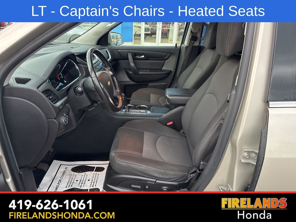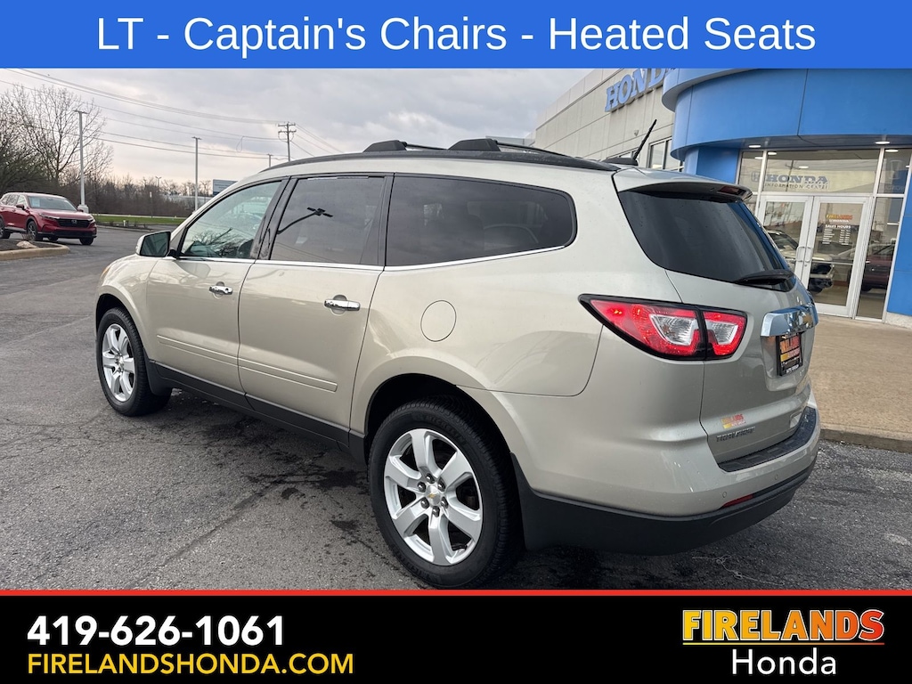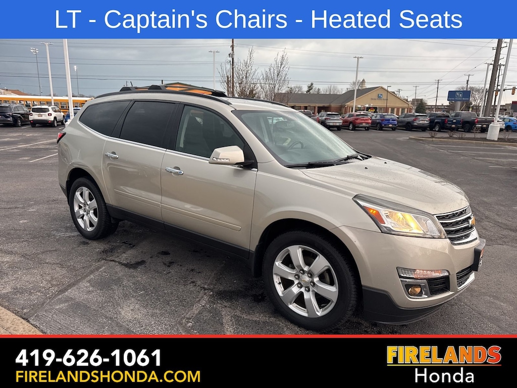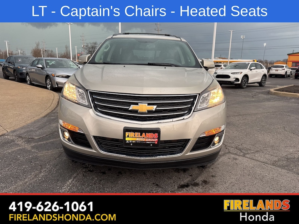 Firelands Honda is proud to offer this fantastic-looking 2017 Chevrolet Traverse in Champagne Silver Metallic. This Traverse has been checked by our award winning service department. Hot features include: Bluetooth Hands Free, Back Up Camera, Remote Start, Service Records Available, Fog Lights, Clean CARFAX, One Owner, No Accidents, 7 Passenger Seating, Captains Chairs, Heated Front Seats.