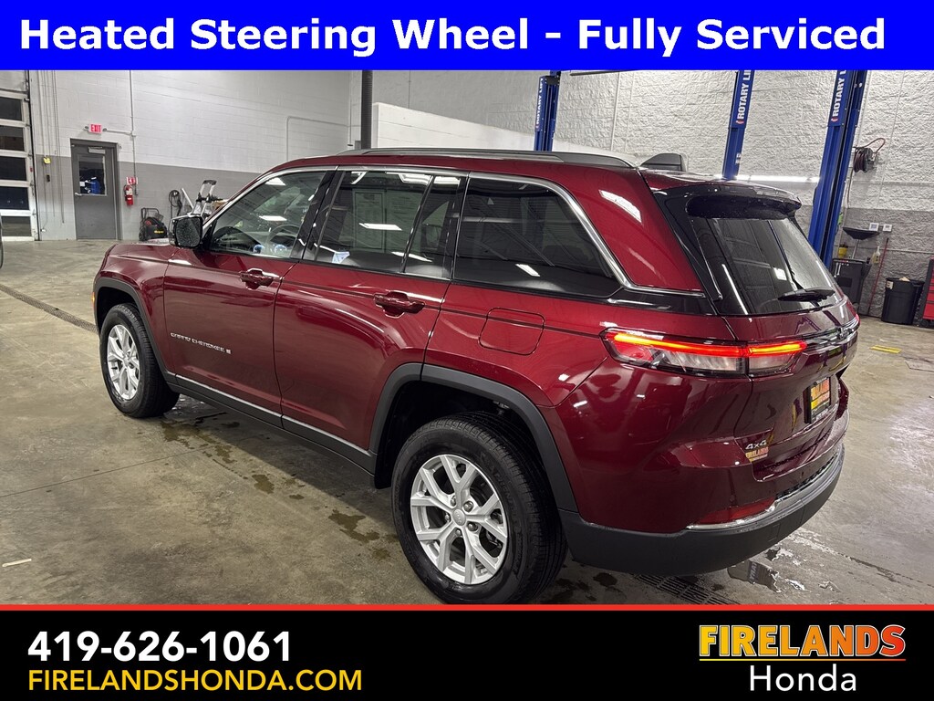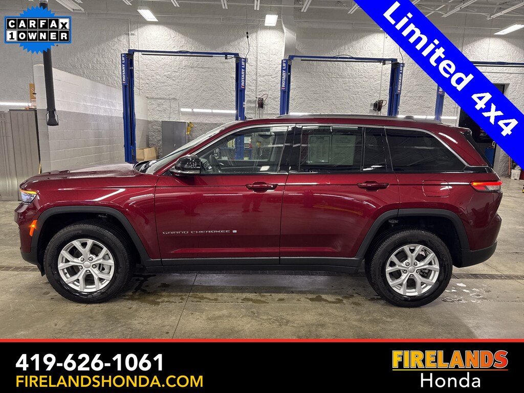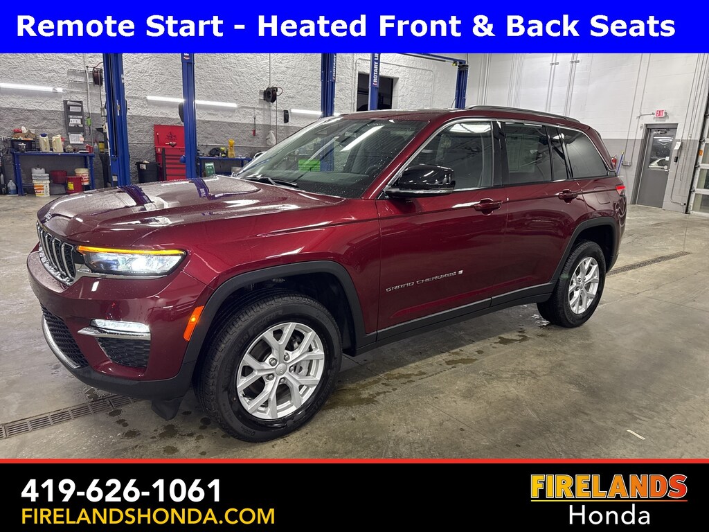 Firelands Honda is proud to offer this terrific-looking 2023 Jeep Grand Cherokee in Velvet Red Pearlcoat. This Grand Cherokee has been checked by our award winning service department. Hot features include: Bluetooth Hands Free, Back Up Camera, Navigation / GPS, Remote Start, Adaptive Cruise Control, Balance of Factory Warranty, Service Records Available, 4x4, Heated Leather Seats, Locally Owned New Car Trade, Lane Departure Warning, Apple Carplay/Android Auto, Blind Spot Detection, Fog Lights, Automatic Emergency Braking, Forward Collision Warning, Rear Cross Traffic Alert, Clean CARFAX, One Owner, No Accidents, Power Liftgate, Memory Seats, Accident Free CarFax, Well Serviced, Heated Steering Wheel, Heated Rear Seats, AM/FM radio: SiriusXM with 360L, Brake assist, Bumpers: body-color, Capri Leatherette Seats, Dual front impact airbags, Dual front side impact airbags, Fully automatic headlights, Heated door mirrors, Low tire pressure warning, Memory seat, Navigation System, ParkView Rear Back-Up Camera, Power door mirrors, Power driver seat, Power Liftgate, Quick Order Package 23E, Radio: Uconnect 5 Nav w/10.1" Display, Speed control, Spoiler, Steering wheel mounted audio controls, Traction control, Turn signal indicator mirrors, Wheels: 18" x 8" Fully Painted Aluminum.