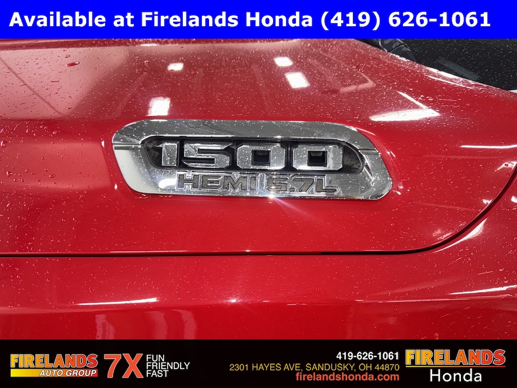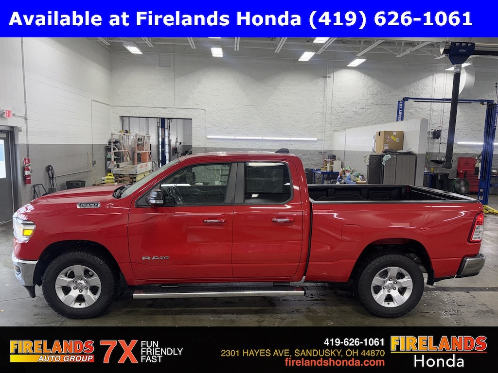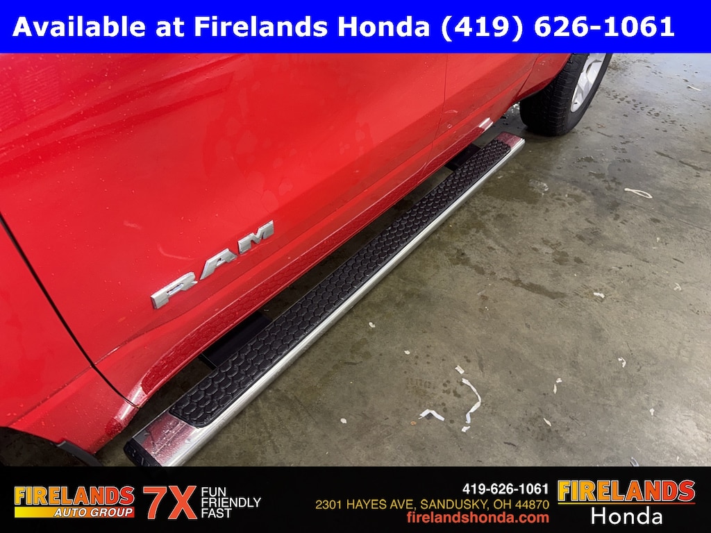 Firelands Honda is proud to offer this beautiful 2019 Ram 1500 in Flame Red Clearcoat. This 1500 has been checked by our award winning service department. Hot features include: Bluetooth Hands Free, Back Up Camera, Remote Start, Balance of Factory Warranty, Service Records Available, 4x4, Fog Lights, Trailer/Tow Package, Trailer Brake Controller, Spray-In Bedliner, Max Trailering 3.92 Gear Ratio, Chrome Running Boards, Power Sliding Rear Window, Power Folding Mirrors, Auto-Dimming Rear-View Mirror, Big Horn IP Badge, Big Horn Level 1 Equipment Group, Class IV Receiver Hitch, Cluster 3.5" TFT Color Display, Foam Bottle Insert (Door Trim Panel), Glove Box Lamp, Power 4-Way Driver Lumbar Adjust, Power 8-Way Driver Seat, Power Adjustable Pedals, Power Heated Fold Away Mirrors, Quick Order Package 25Z Big Horn/Lone Star, Radio: Uconnect 4 w/8.4" Display, Rear Dome w/On/Off Switch Lamp, Rear Power Sliding Window, Rear Window Defroster, Single Disc Remote CD Player, SiriusXM Satellite Radio, Steering Wheel Mounted Audio Controls, Sun Visors w/Illuminated Vanity Mirrors, Universal Garage Door Opener.