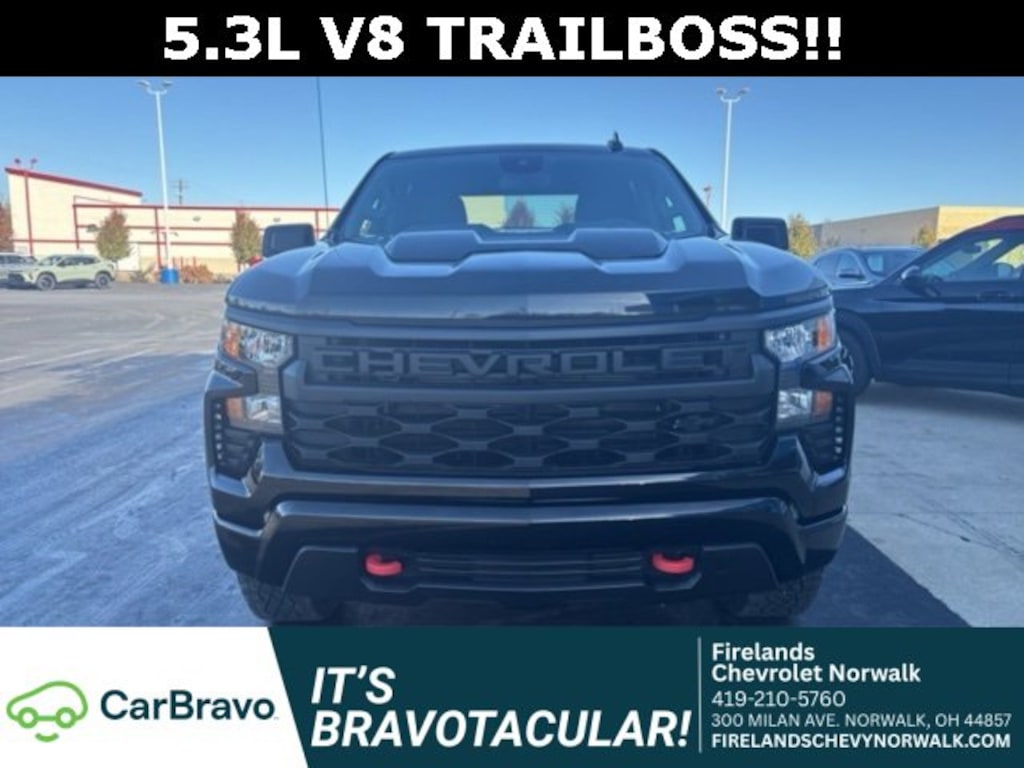 Car Bravo Certified, 1-Owner, Great Price, Clean CarFax, Like New, 4WD / 4x4 / AWD, Navigation System, CarPlay, Android Auto, Bluetooth, Backup Camera, Parking Sensors, Steering Wheel Controls, Cruise Control, Keyless Start, Keyless Entry, Premium Audio, Satellite Radio, Premium / Alloy Wheels, Tow Package, Trailer Package, Trailer Hitch, Silverado 1500 Custom Trail Boss, 4D Crew Cab, EcoTec3 5.3L V8, 4WD, Black, Black Cloth, 10-Way Power Driver Seat w/Lumbar, 120-Volt Bed Mounted Power Outlet, 120-Volt Interior Power Outlet, 3.5 Monochromatic Display Driver Info Center, Auto-Locking Rear Differential, Black Chrome Exhaust Tip (LPO), Bluetooth® For Phone, Chevrolet Connected Access Capable, Chevytec Spray-On Black Bedliner, Color-Keyed Carpeting Floor Covering, Custom Convenience Package, Dark Appearance Package, Deep-Tinted Glass, Dual Rear USB Ports (Charge Only), Electric Rear-Window Defogger, Electrical Steering Column Lock, Electronic Cruise Control, EZ Lift Power Lock & Release Tailgate, Front Frame-Mounted Black Recovery Hooks, Front Rubberized Vinyl Floor Mats, HD Rear Vision Camera, Heavy-Duty Air Filter, Hill Descent Control, Hitch Guidance, LED Cargo Area Lighting, Manual Tilt Wheel Steering Column, OnStar & Chevrolet Connected Services Capable, Performance Red Recovery Hooks, Power Front Windows w/Driver Express Up/Down, Power Front Windows w/Passenger Express Down, Power Rear Windows w/Express Down, Preferred Equipment Group 2CX, Rear 60/40 Folding Bench Seat (Folds Up), Rear Rubberized-Vinyl Floor Mats, Remote Keyless Entry, Remote Vehicle Starter System, Single Outlet Exhaust, SiriusXM Radio, Standard Tailgate, Suspension Package, Theft Deterrent System (Unauthorized Entry), Trailering Package, Wi-Fi Hot Spot Capable.